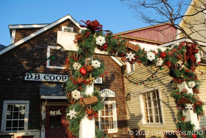 定番といえば、パーク内を彩るクリスマスリースもそこここに。毎年違うデザインだから写真を撮って見比べるのも楽しみのひとつ。