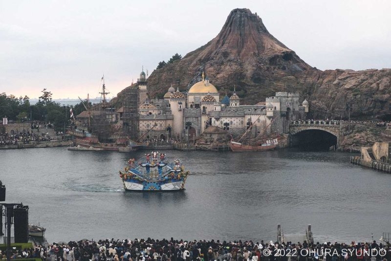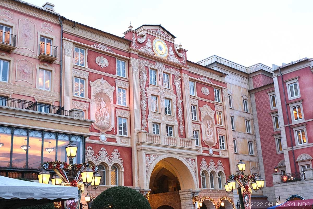 ポルト・パラディーゾ・サイドの宿泊時だけ味わえるのが、ほぼ無人のパークの眺めを見ることができること。写真は朝の様子ですが、トラックや自転車で移動するスタッフが見えるほか、ウェディングの記念撮影も垣間見ることができます。滞在時は23時頃に、新しいショーの練習もお部屋から拝見できました。