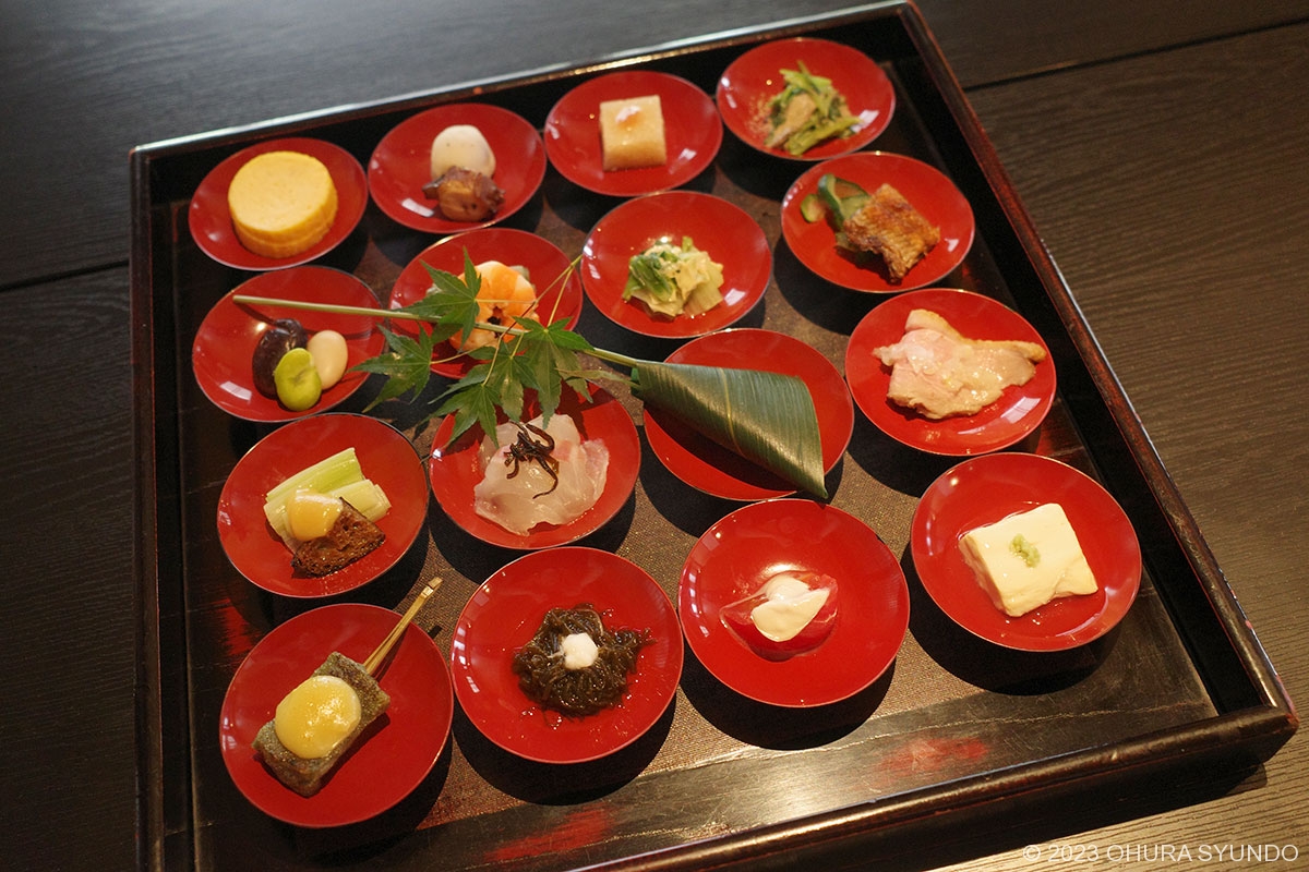 飲み物のオーダーをした後に出てくるのが、お盆に朱塗りの器に載せられたおばんざい十六点盛。季節ごとに提供されるおばんざいは異なりますが、私が訪れた時期は初夏。よもぎ麩の白味噌掛けやうざく、トマトの白和えなど夏の食材を使用したメニューが並びました。