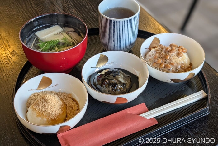 食事は済ませてきたのですが、なにしろ大のお餅好き。好きな味が選べる「お好み3色もちセット」に心惹かれ、納豆、ごま、きなこでオーダーすることに。甘いモノのあとはしょっぱいもの、ということでお雑煮スープも頼んでみました。